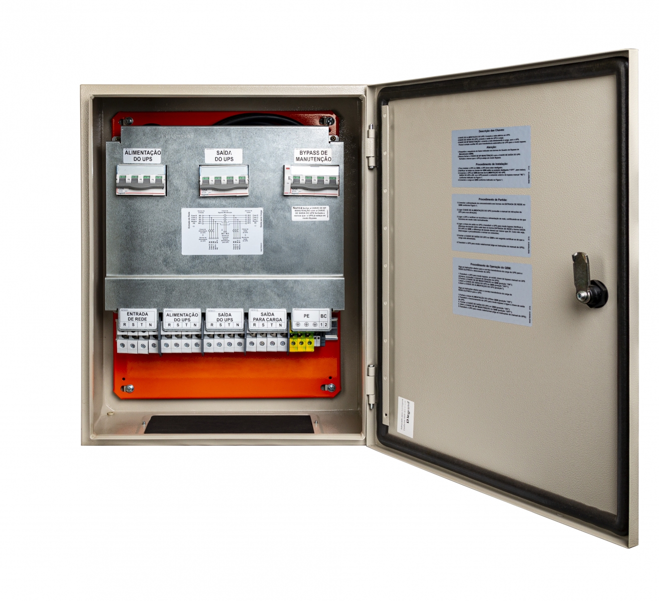 QBM - Quadro de Bypass de Manutenção compatível com a linha de nobreak (UPS) Trifásico Keor T BR. Composto por 03 x Chaves Seccionadoras 125A tetrapolar, para atender a configuração (1+0), o QBM possibilita realizar manutenção preventiva ou corretiva, sem a necessidade de desligar a carga crítica ou realizar paradas programadas.