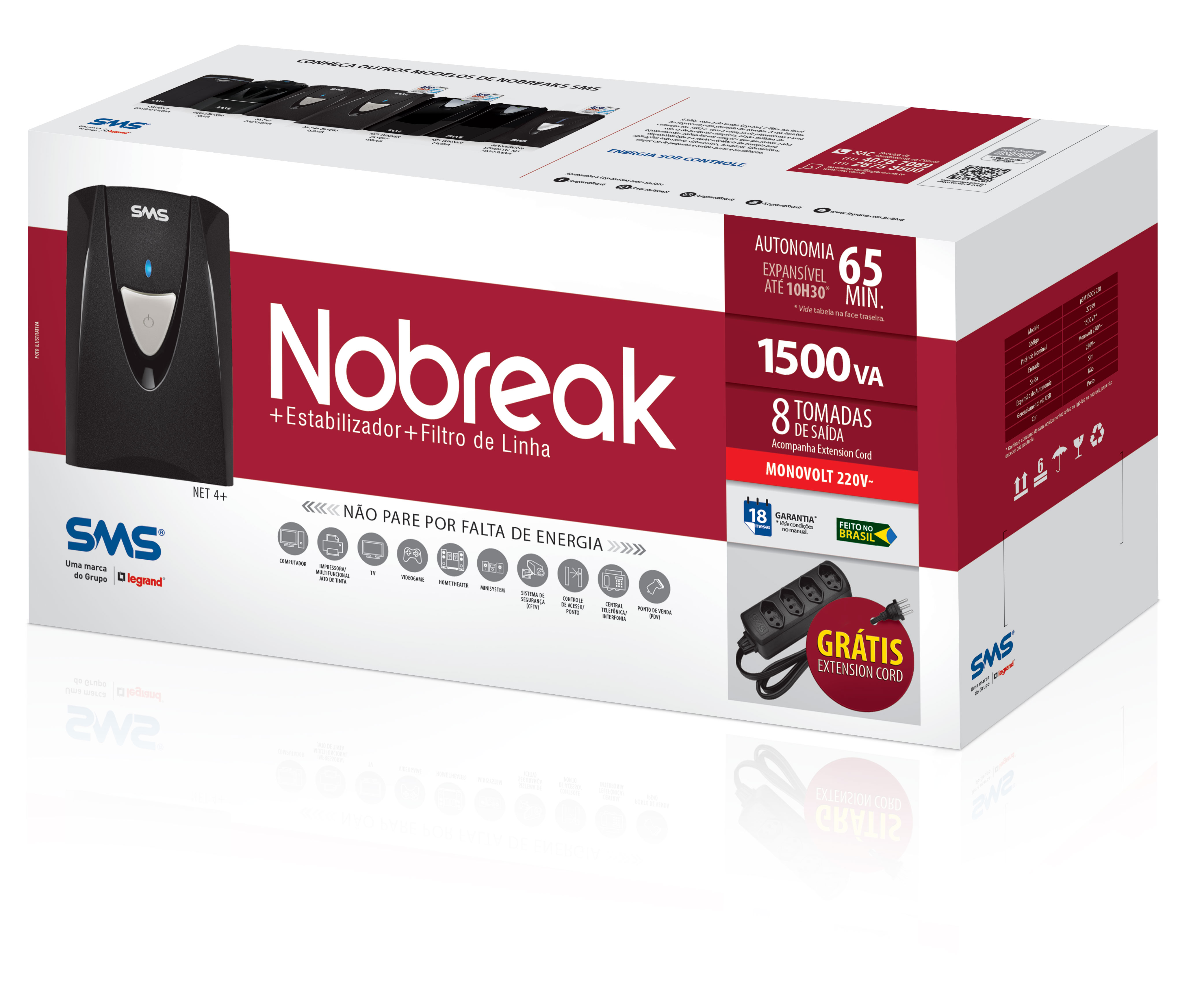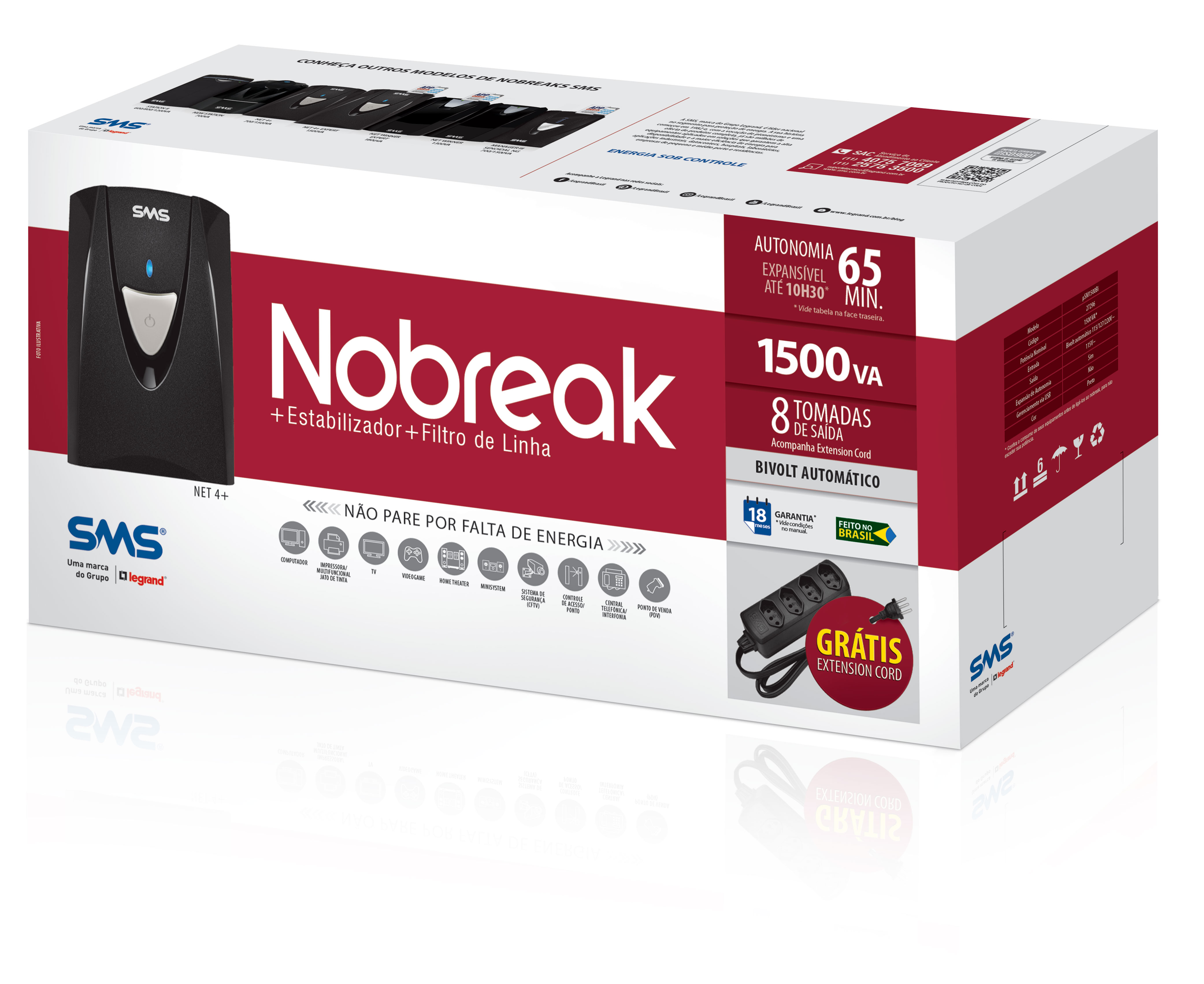 Grátis Extension Cord:Acompanha extensão elétrica gratuita que aumenta a quantidade de tomadas disponíveis no nobreak e facilita a conexão de equipamentos plug&play. |
