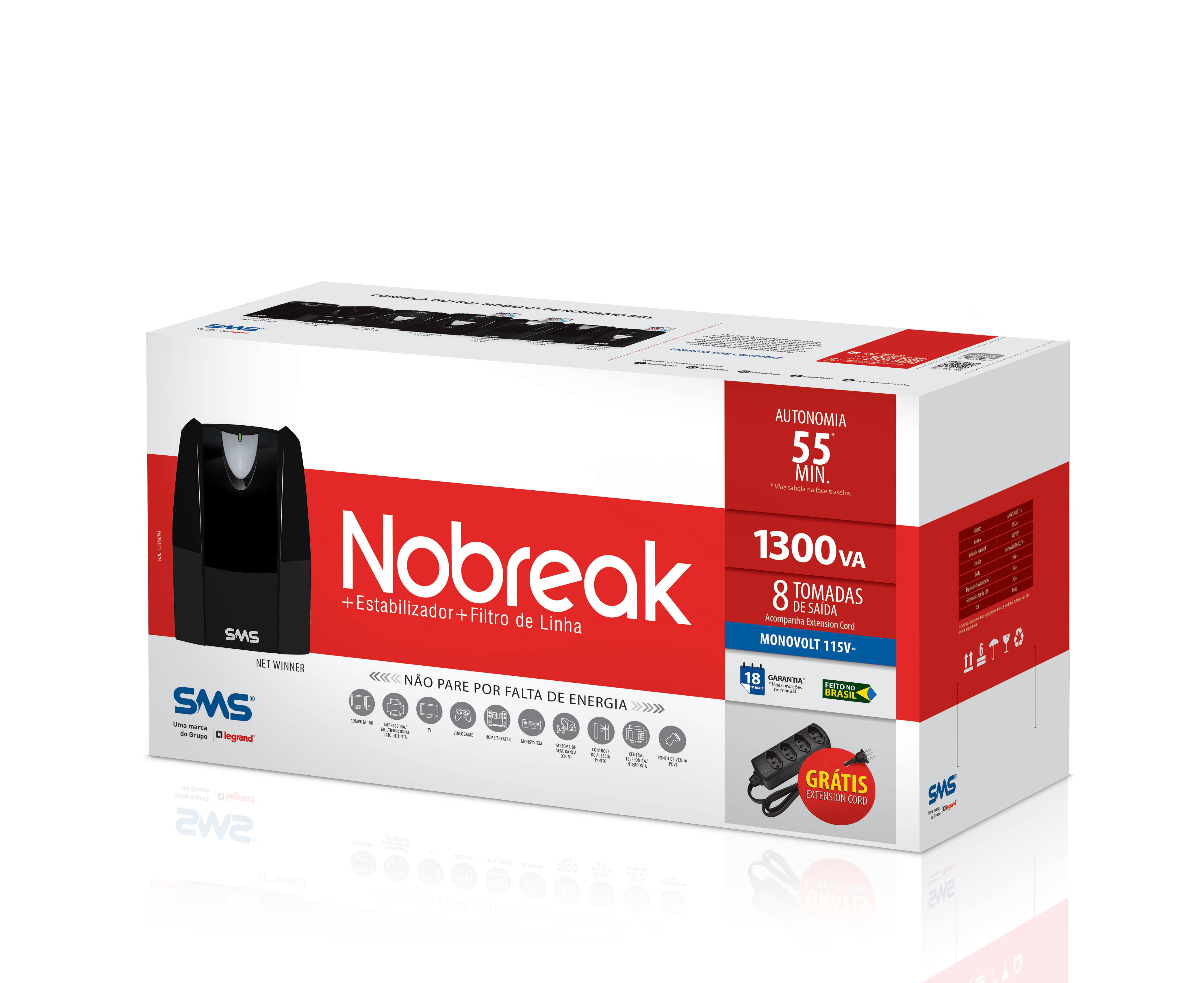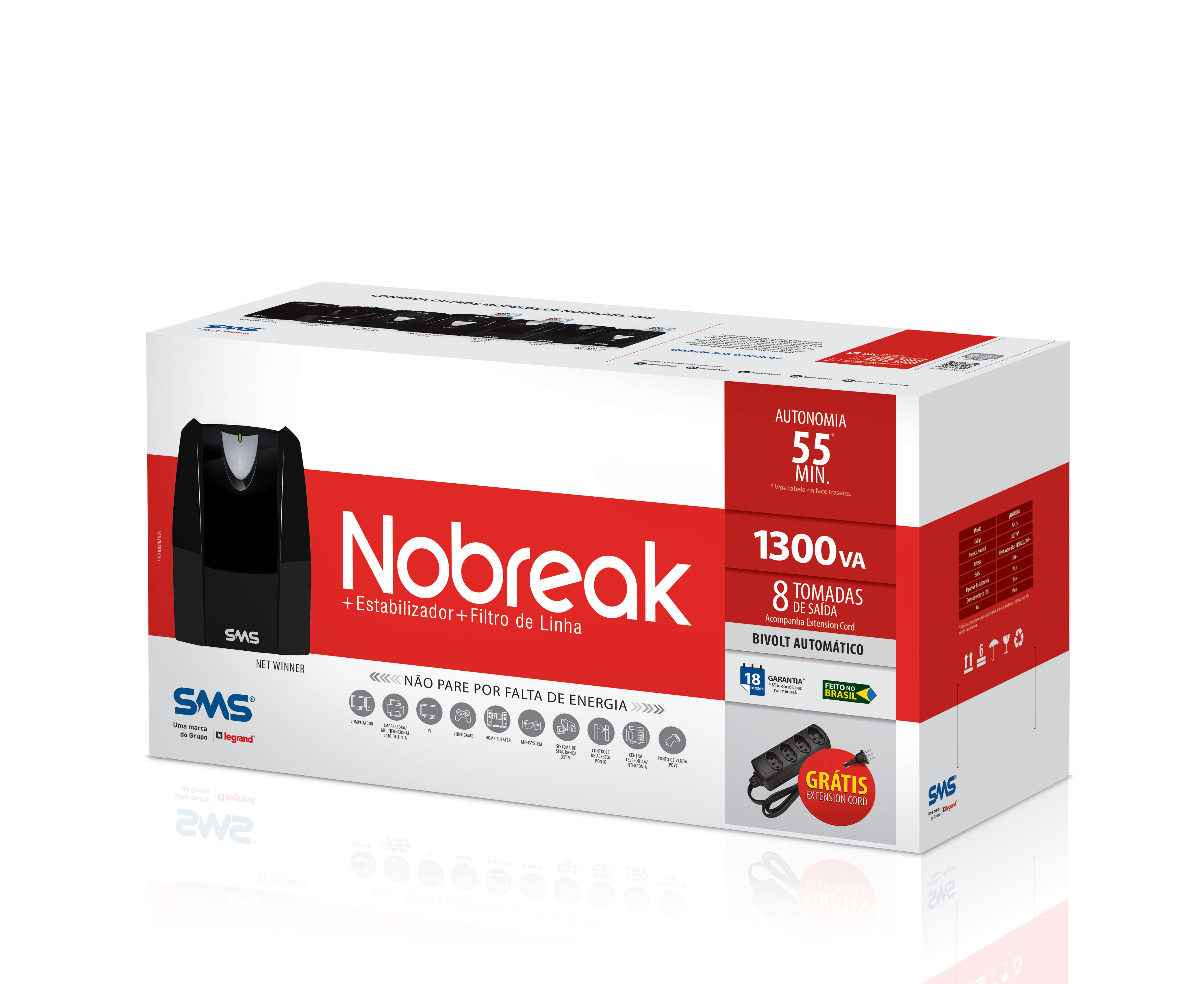 Grátis Extension Cord:Acompanha extensão elétrica gratuita que aumenta a quantidade de tomadas disponíveis no nobreak e facilita a conexão de equipamentos plug&play. |