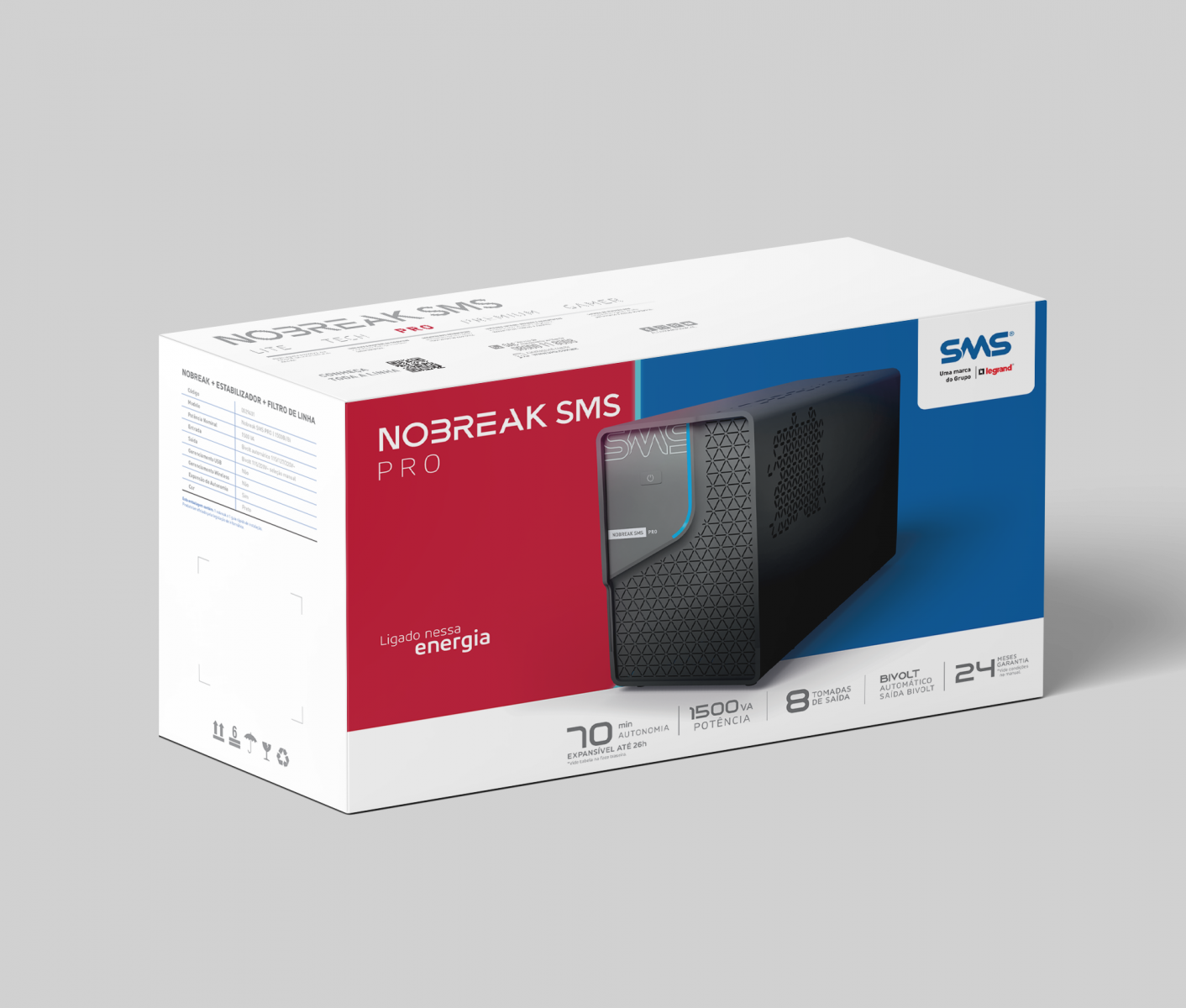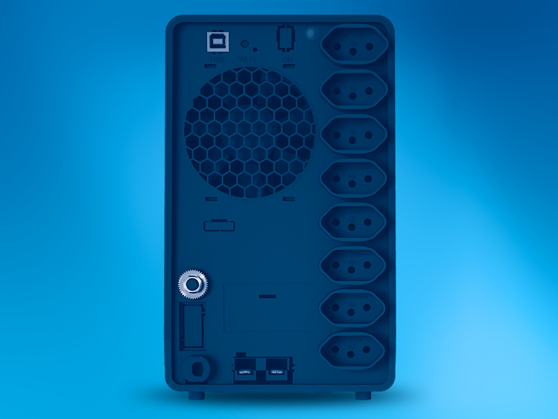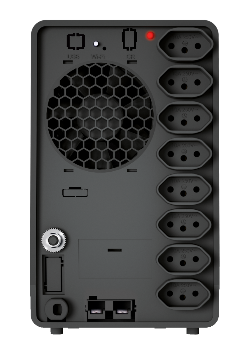Mais tomadas de saída:8 tomadas de saída no padrão NBR 14136, sendo duas delas com capacidade de 20A para a conexão de equipamentos que demandam mais energia. |